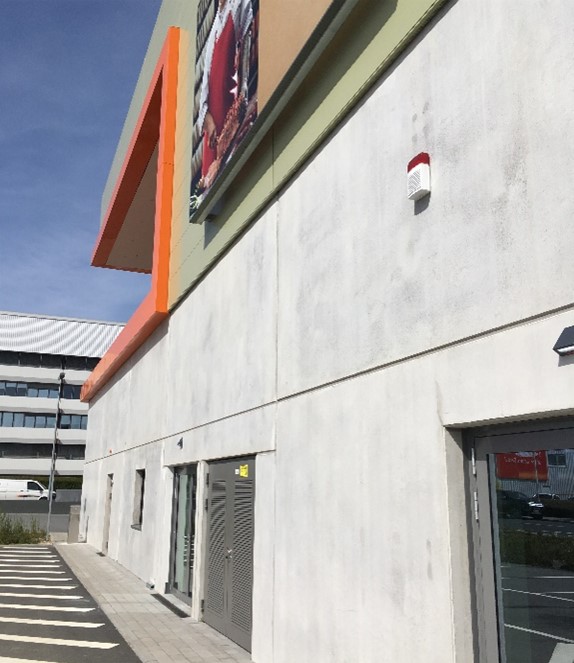 Als Außenwände kommen unterschiedliche Konstruktionen zum Einsatz (Stahlkassetten­wand, Stahlbeton-Sandwich-Elemente, hinter­lüftete Stahlbetonwand). Das  Flachdach wurde als Stahltrapezblechdach mit  mineralischer Dämmung ausgeführt, die Decke zwischen 1. OG und EG als Abhangdecke.