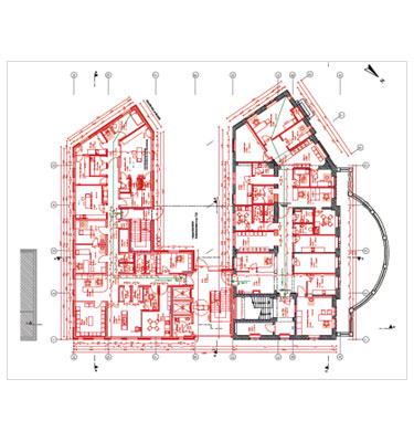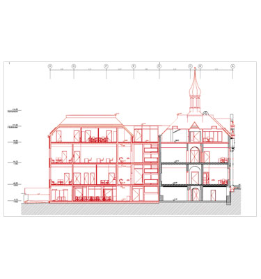 Hierzu werden einige derzeit auf dem Grund­stück befindlichen Gebäude abgerissen, das Bestandsgebäude, welches unter Denkmal­schutz steht, teilweise entkernt und mit einem Verbindungsbau an den geplanten Neubau angeschlossen.