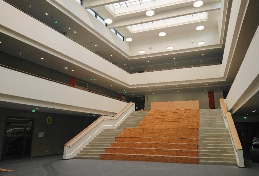 - Hochwertige Raumakustik in Aula, Unterrichtsräumen, Speiseraum und Fluren