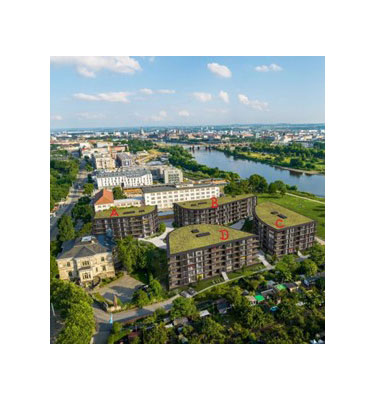 Neubau einer Wohnanlage unmittelbar an der Elbe in Dresden-Pieschen nach Plänen von Knerer und Lang Architekten Dresden, bestehend aus vier Gebäuden auf gemeinsamer Tiefgarage (ca. 210 Wohnungen) mit einer oberirdischen Bruttogeschossfläche von ca. 21.090 m².