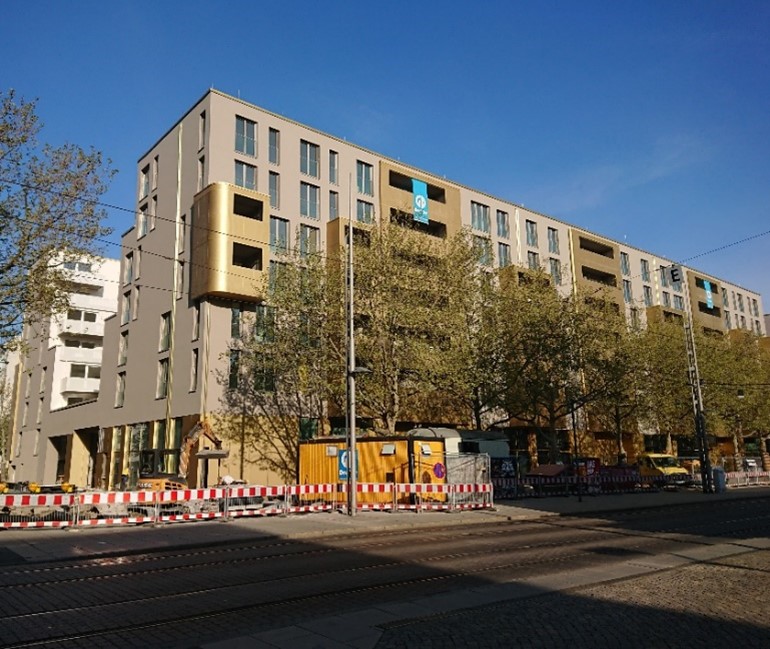 Neubau einer Wohnanlage mit Gewerbeeinheit nach Plänen von Knerer und Lang Architekten Dresden, bestehend aus zwei Gebäuden auf gemeinsamer Tiefgarage (ca. 220 Wohnungen) mit einer oberirdischen Bruttogeschossfläche von ca. 20.000 m².